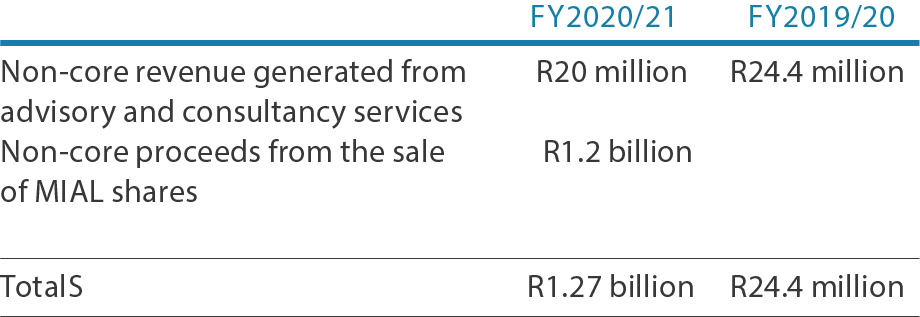 COVID-19 had a severe negative impact on the market conditions, which resulted in low business activity in the procurement of airport services, concessions and training. In FY2020/21, we relied on existing contracts for the generation of non-core revenue, which was the Mumbai International Airport Limited performance fees and Kenneth Kaunda International Airport Operational Readiness and Airport Transfer contracts. Despite the unfavourable environment for all airport companies across the world, we secured new advisory and consultancy work during the year.