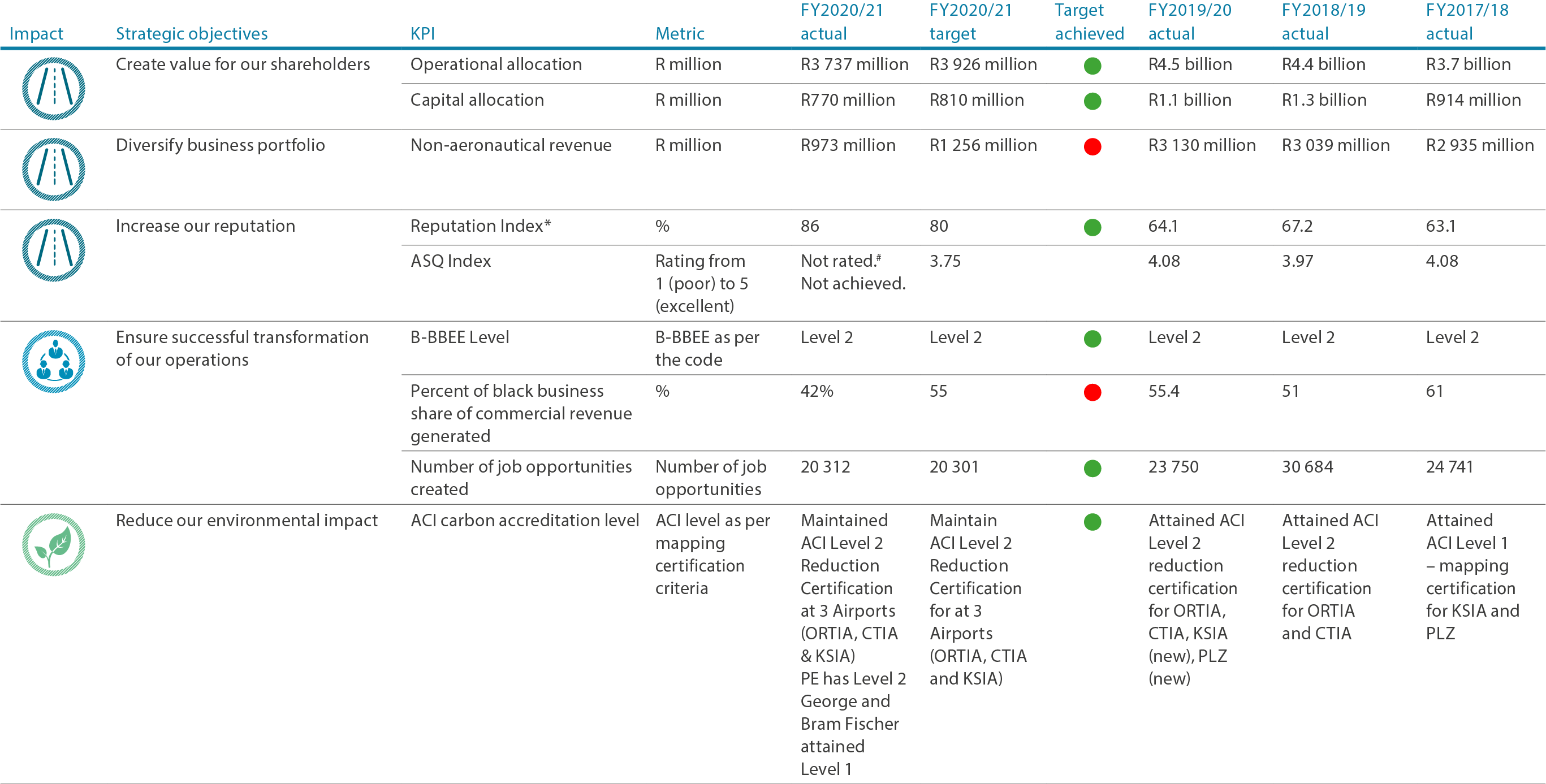 *Previous years measured as weighted average. REPTRAK survey was not conducted in the 2020/21 financial year due to budget challenges as part of the impact COVID-19. In this financial year, the KPI is measured as a percentage of completion of the engagement plans the executive committee committed to and which was approved by the Board. A target of 80% has been set and performance against this target is measured as the average percentage score of the completed quarterly engagements in line with the number of engagement frequencies stakeholder owners have committed to for each stakeholder.
