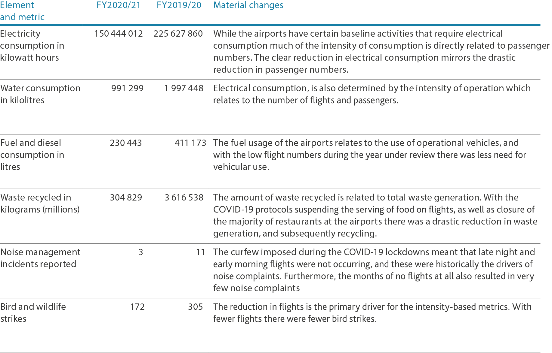 The utilisation of other resources including electricity, water and waste decreased as a result of fewer flights, as well as most of our workforce working remotely. While there were reductions in resource utilisation in absolute terms, efficiencies were much lower, given that certain airport infrastructure requires a baseline of activity, regardless of passenger and staff numbers.